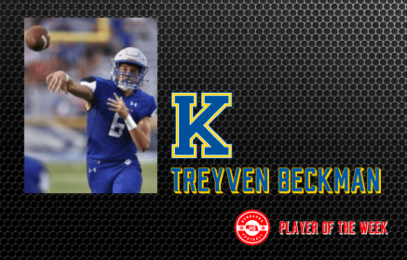 Treyven Beckman | Kearney | QB – Beckman calmly threw for 329 yards and three touchdowns, including a 69-yard strike to Zander Reuling with :40 remaining in a 35-34 victory over then-No. 4 Bellevue West. Beckman also rushed for a score in the victory. Kearney opened the scoring on Beckman’s 79-yard dagger to Karter Lee before Beckman hit Ben Cumpston on a 76-yard pass in the road victory for the unbeaten Bearcats, who are No. 5 this week in the Nebraska HS Football Class A Top 10. The steady-handed Beckman has 791 passing yards and eight touchdowns this season.