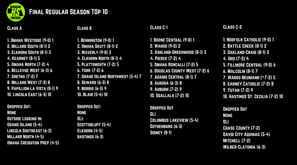 Nebraska HS Football (nebhsfb.com) Top 10 (Final Regular Season)