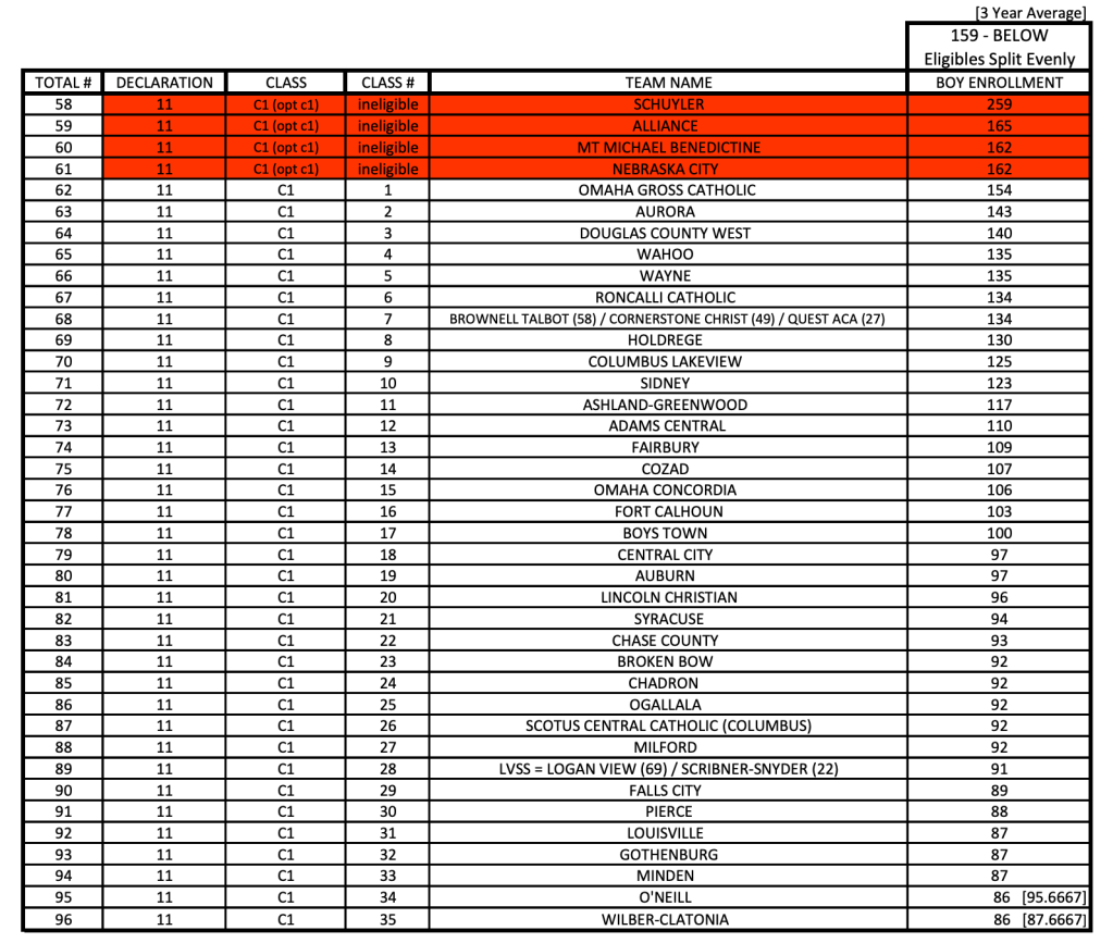 Schuyler, Alliance, Mount Michael, and Nebraska City have opted down to Class C-1 and will be playoff ineligible for at least the first season of the two-year cycle. In total, 35 schools will compete in Class C-1. 2022 Class B runner-up Omaha Gross drops to Class C-1. Newcomers include a co-op between Omaha Brownell-Talbot, Cornerstone Christian, and Quest Academy along with Chase County, Milford, Louisville, and Wilber-Clatonia. The latter four programs are up from Class C-2.