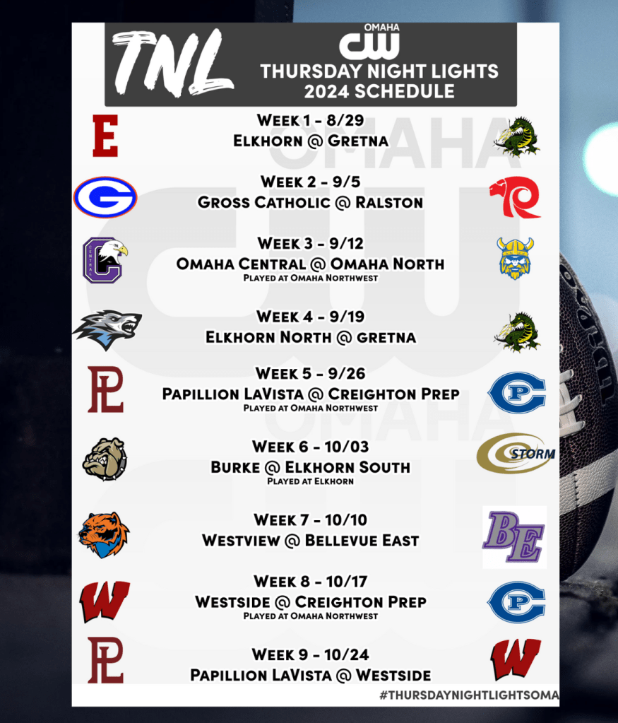 Two-time defending Class A champion Omaha Westside will be featured against rival Creighton Prep in Week 8 before rounding out the season with a battle at home against Papillion-La Vista on Oct. 24. Also appearing twice are Creighton Prep and Papillion-La Vista, who will square off in Week 5 on Sept. 26.