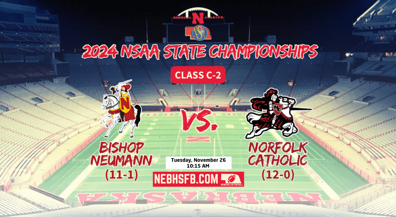 Bishop Neumann takes the nearly 30-mile trek down Highway 77 from Wahoo as it seeks to win its first state championship on the gridiron since 2003. Neumann has won 11 straight games since falling in Week 1 to Norfolk Catholic, 28-21.
