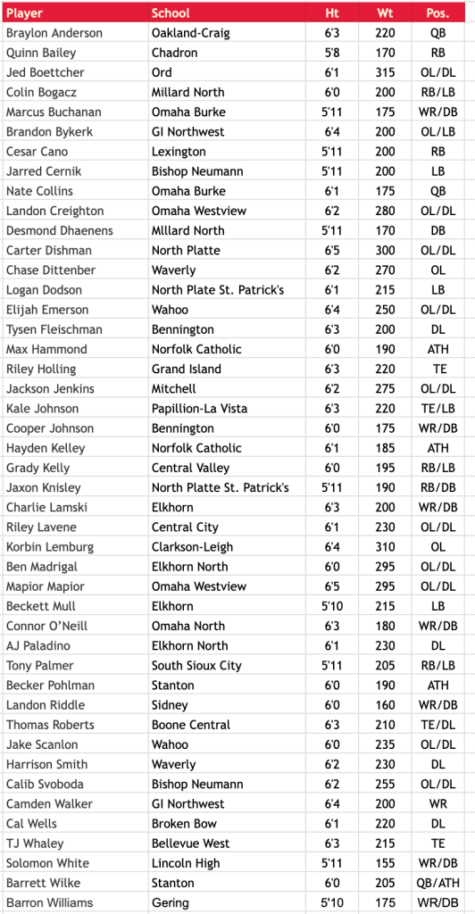 Boys Town head coach Chris Nizzi will take the helm of the South squad. Nizzi led the Cowboys to a 9-2 record in 2024 and a spot in the Class C-1 quarterfinals featuring Kansas State signee Darien Whitaker Jr.