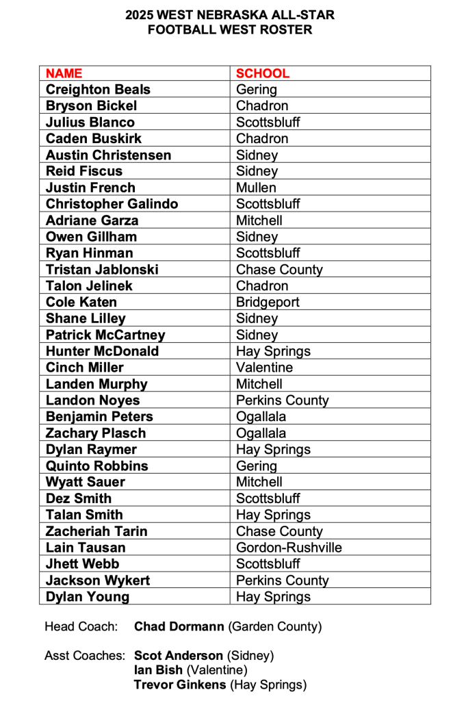 Garden County’s Chad Dormann will lead the West team. Dormann will be assisted by Sidney’s Scot Anderson, Ian Bish of Valentine, and Trevor Ginkens of Hay Springs.