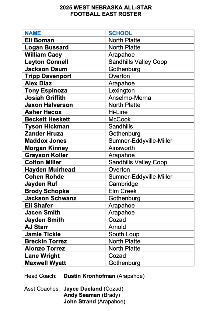 Dustin Kronhofman of Arapahoe will take the helm of the East squad. Assistant coaches for the East will be Jayce Dueland of Cozad, Brady’s Andy Seaman, and Arapahoe’s John Strand.