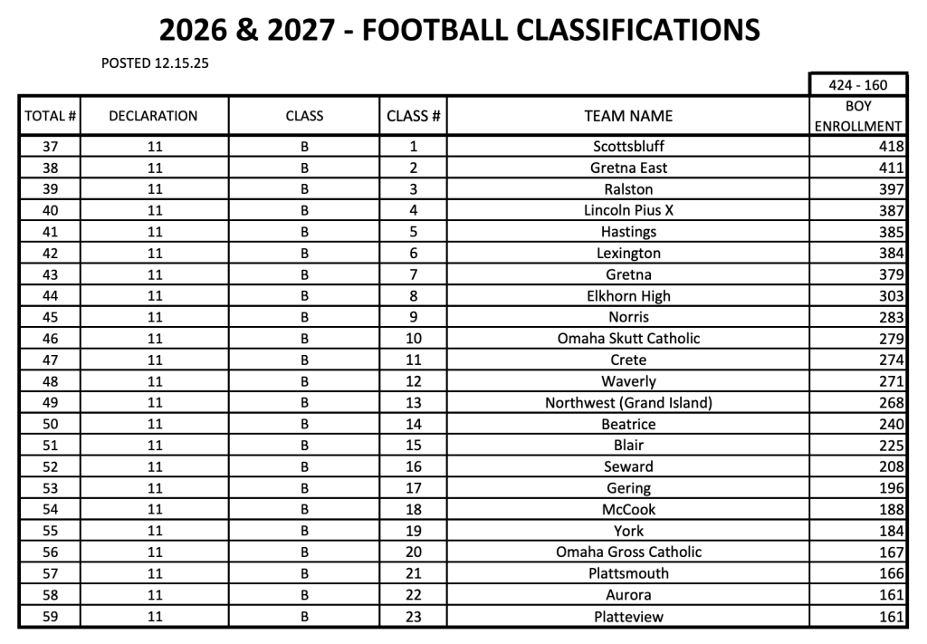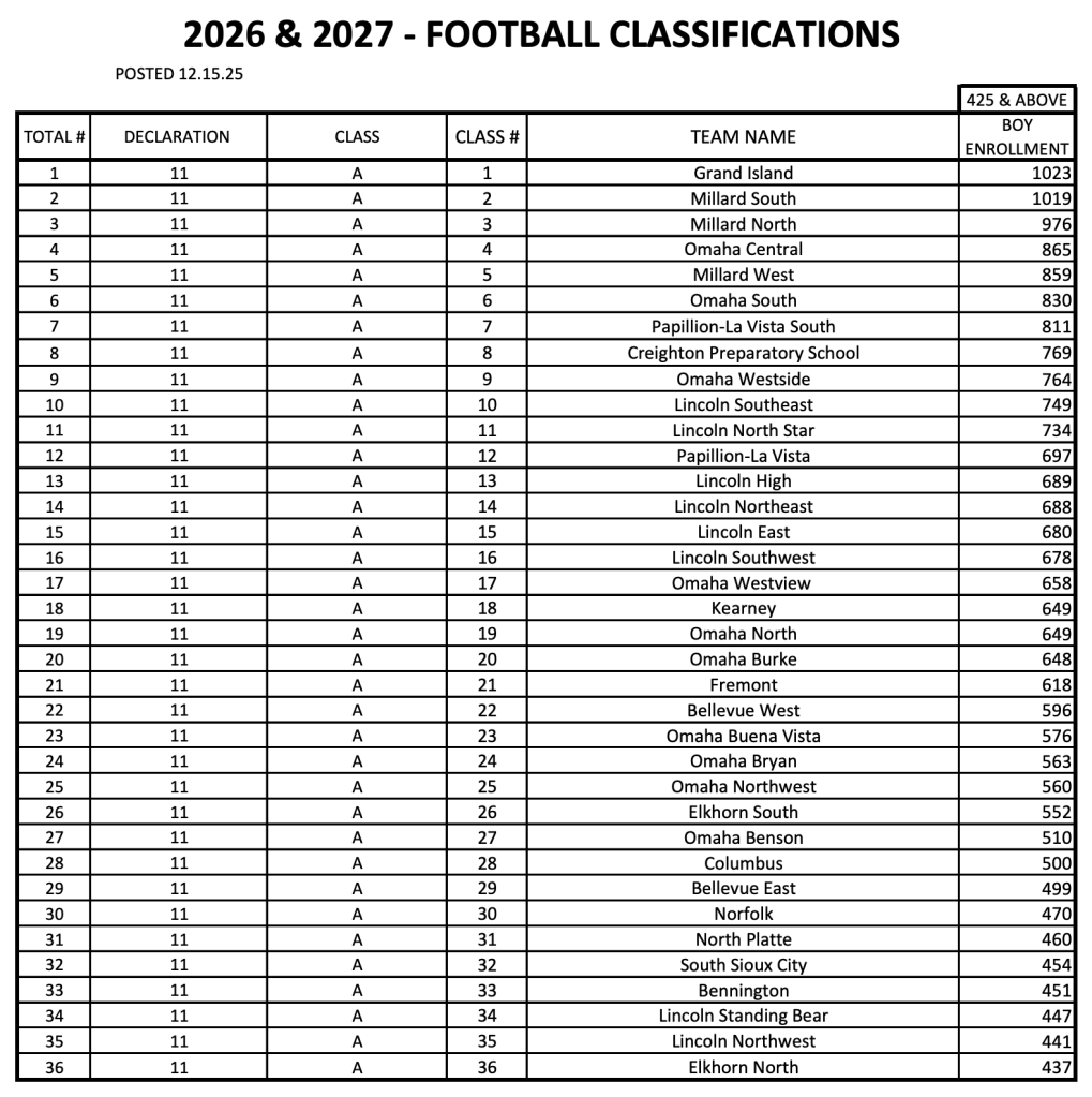 2026 Season, Class A, Class B, Class C-1, Class C-2, Eight Man, Six Man NSAA Realignment: 2026 and 2027 Football Classifications Released Date: December 15, 2025Author: Scott Hansen 0 Comments NSAA Realignment 2026/2027 Class A Class B Class C-1 Class C-2 Class D-1 Class D-2 Class D-3 Class D-6 Share this: Click to share on X (Opens in new window) X Click to share on Facebook (Opens in new window) Facebook Like Loading... Related